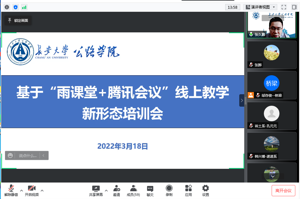 2022年3月18日下午,学院联合学堂在线“雨课堂”教育与培训中心举办“雨课堂+腾讯会议”线上教学新形态培训会。学堂在线陕西省区项目经理康朝晖、雨课堂教育培训中心高级培训师申正宇,学院副院长张久鹏、教务办、各系(中心)教师近100人参加培训。
