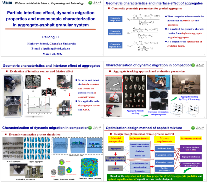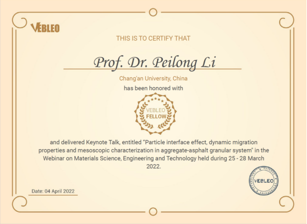 近日,我院栗培龙教授被授予国际科学组织Vebleo协会会士(Vebleo Fellow),并受邀在Vebleo主办的科学、工程与技术网络研讨会(Webinar onMaterialsScience, Engineering and Technology)中做了主题为“Particle interface effect, dynamic migration properties and mesoscopic characterization in aggregate-asphalt granular system”的主旨报告(Keynote Talk)。栗培龙教授介绍了他和团队在沥青混合料微细观作用行为与机理、表征方法及工程控制方面做出的学术贡献,特别介绍了近年来基于矿料-沥青颗粒体系动态迁移的沥青混合料设计-生产-施工-服役全过程量化表征与控制系列成果。