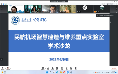 2022年6月6日下午,民航机场智能建造与维养重点实验室采用线上线下相结合的方式成功举办“人工智能技术在民航机场场道建管养的应用”学术沙龙。本次学术沙龙由重点实验室主任汪海年教授召集,特邀yl6809永利申爱琴教授、郝培文教授、圭目机器人有限公司创始人桂仲成博士、民航机场工程技术研究中心叶松总工程师、西北民航建设集团有限公司戴征总经理、江苏增光新材料科技股份有限公司周庆月总经理做主题发言。yl6809永利副院长、民航重点实验室副主任张久鹏教授主持学术沙龙,民航西北设计院、咸阳机场、福州机场、翔安机场、邯郸机场等管理和技术骨干以及机场工程系全体教师和在校研究生80余人参加了学术沙龙。