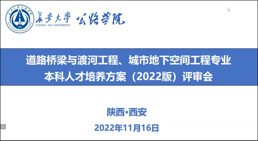 2022年11月16日下午,学院在线上召开道路桥梁与渡河工程、城市地下空间工程专业本科人才培养方案(2022版)专家评审会。专家组由西安理工大学党发宁教授担任组长,北京建筑大学季节教授担任副组长,成员包括西安建筑科技大学宋战平教授、青岛理工大学张素磊教授、北京中航建研航空设计咨询有限公司总经理江慧娟正高级工程师、中交第一公路勘察设计研究院有限公司陈团结正高级工程师、中交第二公路工程局有限公司李强战正高级工程师。yl6809永利院长陈建勋、副院长张久鹏、培养方案优化工作小组成员及教务管理人员参加会议,会议由张久鹏主持。