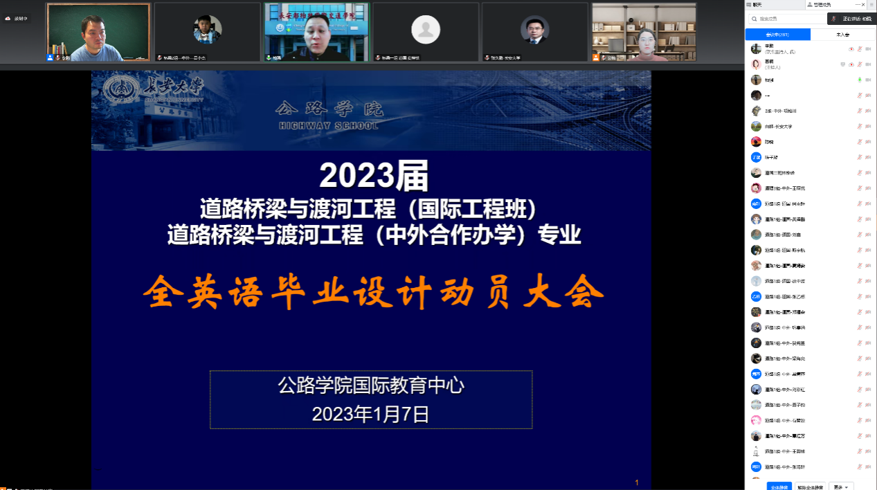 2023年1月7日上午9:00,我院国际教育中心面向道路桥梁与渡河工程(国际工程班)及道路桥梁与渡河工程(中外合作办学)专业召开了2023届全英文毕业设计(论文)动员会。双语教学团队50余名指导教师及200余名学生参会。会议由国际教育中心副主任李鹏主持。