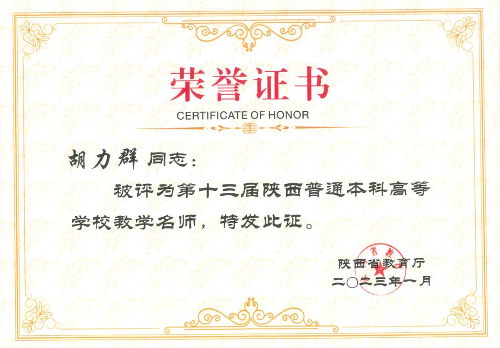根据陕西省教育厅办公室《关于开展第十三届陕西普通本科高等学校教学名师奖评选表彰工作的通知》(陕教高办〔2022〕27号),第十三届陕西普通本科高等学校教学名师奖评选工作经学校推荐、申报公示、专家评选、厅务会审议、结果公示等工作程序,我院道路系胡力群教授荣获第十三届陕西普通高等学校教学名师奖。