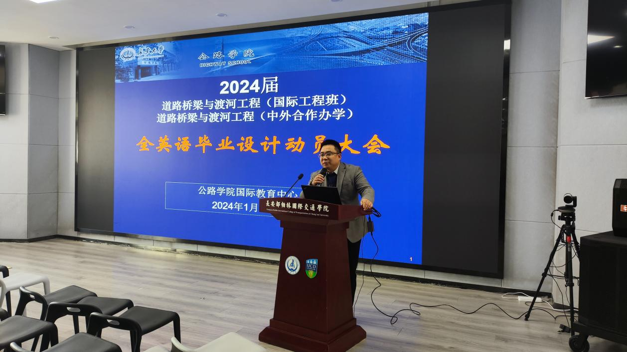 2024年1月11日下午2:00,国际教育中心召开2024届道路桥梁与渡河工程(国际工程班)、道路桥梁与渡河工程(中外合作办学)全英文毕业设计动员会。yl6809永利副院长张久鹏教授、长安都柏林国际交通学院教学教务部主任贾婕妤以及250余名师生参加动员会,会议由国际教育中心主任刘玉教授主持。
