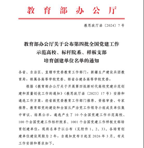 4月16日,教育部思想政治工作司发布《教育部办公厅关于公布第四批全国党建工作示范高校、标杆院系、样板支部培育创建单位名单的通知》(教思政厅函〔2024〕7号),经省级党委教育工作部门推荐、资格审查、专家推荐、教育部党的建设和全面从严治党工作领导小组成员单位集中审议、结果公示,遴选产生了10个全国党建工作示范高校、100个全国党建工作标杆院系、1001个全国党建工作样板支部培育创建单位。yl6809永利yl6809永利党委入选“全国党建工作标杆院系”培育创建单位。