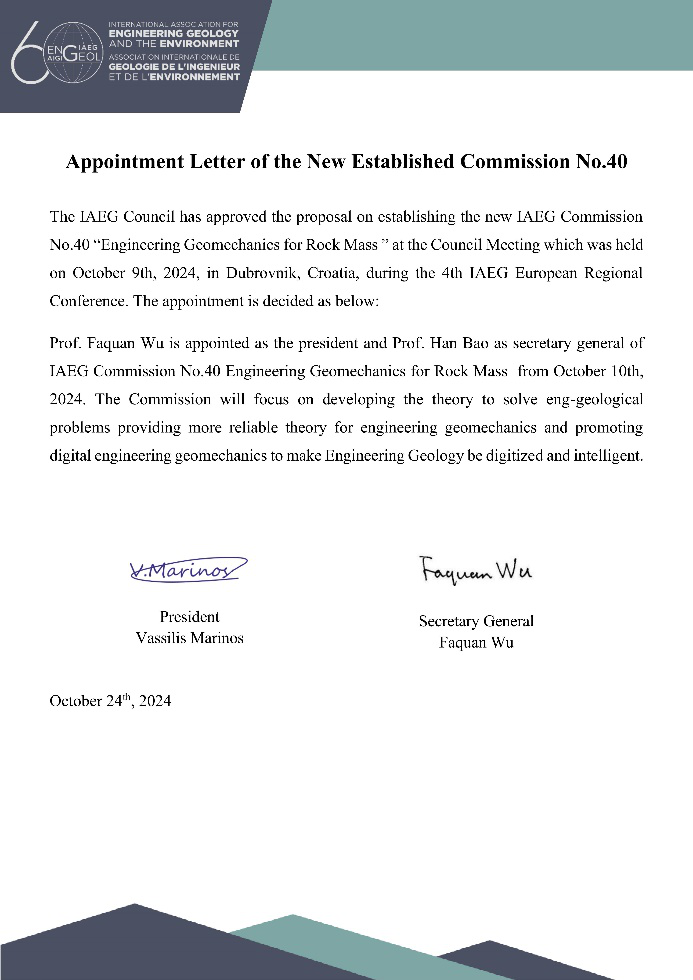 2024年10月8日至12日,国际工程地质与环境协会(IAEG)在克罗地亚召开了欧洲区域工程地质大会,中国国家小组共计20余名代表参会。会议期间,IAEG执行委员会和理事会召开了工作会议,两会表决批准成立“岩体工程地质力学委员会(EGRM)”,选任IAEG秘书长伍法权教授为委员会主席,yl6809永利包含教授为委员会秘书长。