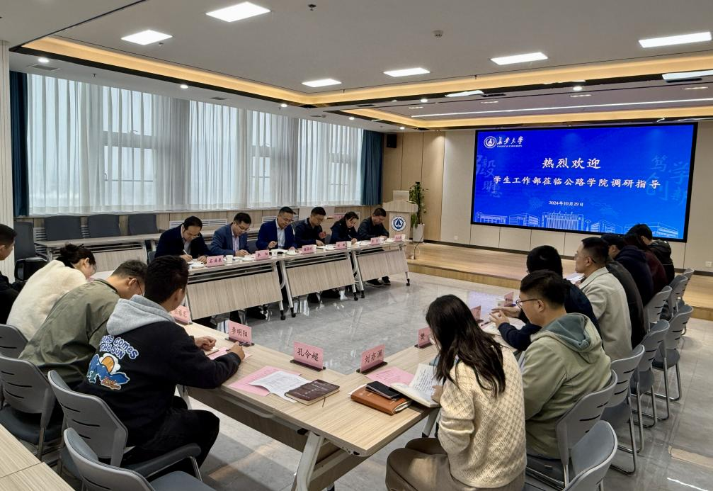 张久鹏代表学院向学工部一行调研指导学生工作表示欢迎,对学工部一直以来给予学院学生工作的支持和帮助表示感谢。他指出,学生工作既是学院的中心工作和重点工作,也是一项任务艰巨、很有成就感的工作;希望在学工部的指导下,学院全体辅导员凝心聚力、勇于担当,创新思路、开拓进取,把思想政治工作贯穿人才培养全过程,擦亮学工品牌、提升育人成效,为学校学生工作高质量发展贡献力量。