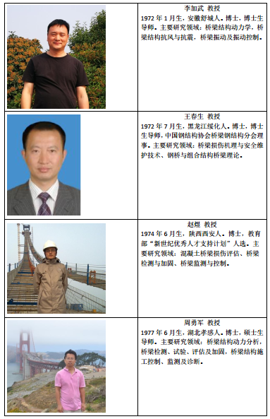 桥梁工程学科依托土木工程、交通运输工程一级博士点和博士后科研流动站,设有桥梁结构安全技术国家工程实验室、交通运输部旧桥检测与加固技术交通行业重点实验室、公路大型结构安全教育部工程研究中心和陕西省公路桥梁与隧道重点实验室,用于风工程研究的风洞实验室,桥梁环境模拟实验室和桥梁结构抗火实验室(在建中)。研发场地及办公面积6000余平方米,各种大型试验仪器设备和研发计算平台价值3000余万元。现有教师60余人,其中博士生导师11人,教授19人,副教授27人。能够进行大型桥梁结构的静动力模型试验、疲劳与耐久性、抗震与抗风、施工监测与控制、检测加固及实桥荷载试验和分析计算。近五年来出版学术著作20余部,制(修)订规范10余部,发表学术论文200余篇,获国家科技奖励2项,省部级奖励30余项,先后完成了多项国家、部省级及重大工程科研项目;完成了包括港珠澳大桥、杭州湾大桥、青岛海湾大桥、舟山连岛工程等著名桥梁在内的近千座桥梁工程的科学研究、施工控制及承载力试验和包括广州海珠大桥、石嘴山黄河大桥等在内的近百座桥梁工程的加固设计与施工技术指导工作。