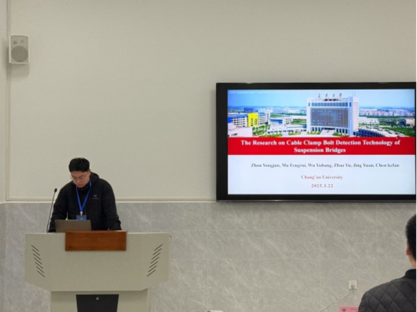 Graduate student Mu Fengrui presented his research on "Research on Cable Clamp Bolt Detection Technology of Suspension Bridges." He introduced an ultrasonic detection model that accounts for the non-uniform stress distribution in bolts, proposed correction factors and influencing factors for a two-stage pull-out theoretical model, and elaborated on the principles and applicability of the ultrasonic pull-out method using practical engineering cases. This study provides valuable theoretical support and technical references for the detection of cable clamp bolts in suspension bridges.