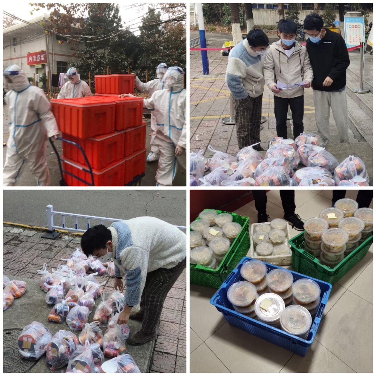 学院防疫工作组时刻关注疫情封闭期间的同学们的情绪,了解大家生活需求,并协调满足同学们的需求。宿舍封闭后,针对同学们日常饭菜供应的问题,我院研究生党员和广大学生干部主动承担起制动同学们的饭菜配送工作。其中硕2004党支部成员、2112党支部吴健辉、李东睿等同学组织并参与进行物资供应、转运协助及饭菜配送工作。每次完成配送,脱掉防护服,他们都是大汗淋漓,但没有一位党员同学有丝毫抱怨,他们想的只是怎样能以最快的速度将饭菜送到宿舍,让同学们在寒冬吃上一口热乎的饭菜。面对时艰,我院研究生党员迎难而上,冲锋在前,践行着共产党人“为人民服务”的宗旨,