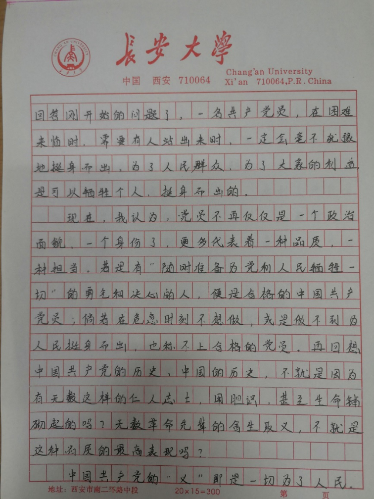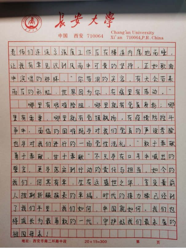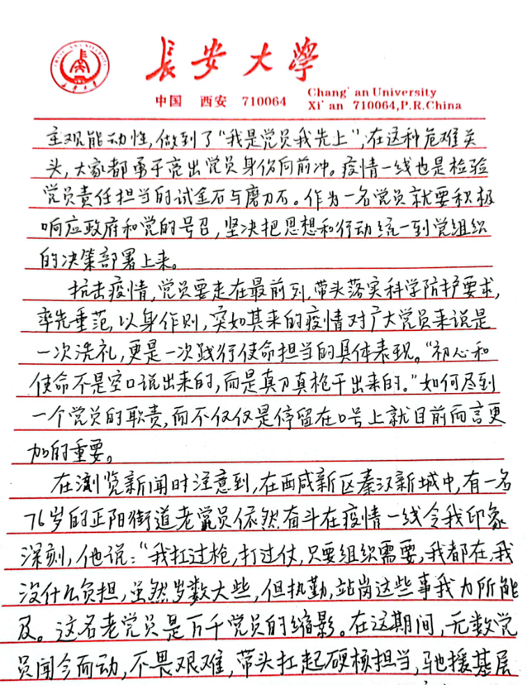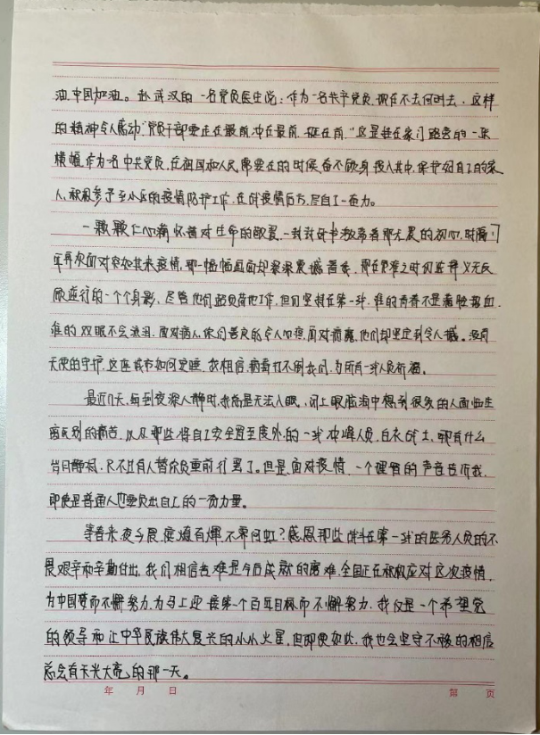 本科生第三党支部预备党员孙博旭在思想汇报中写道,我们要感恩那些战斗在第一线的医护人员的不畏艰辛和辛勤付出,要始终坚信在党的领导下,必将凝聚起万众一心、众志成城的强大合力,共同迎来疫情防控这场硬仗的全胜。