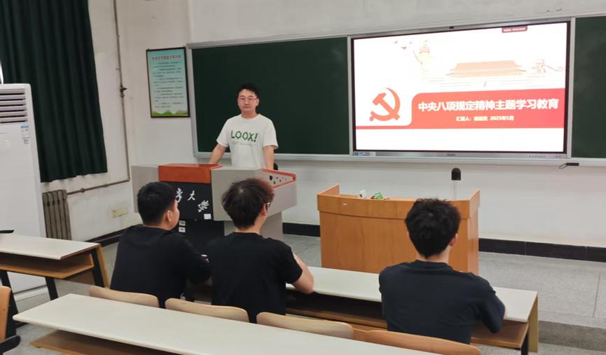 本科生第二党支部书记李璟瑜重点解读了中央八项规定的主要内容及其重要意义,并结合当前作风建设中存在的突出问题,指出党员要坚持廉洁自律、改进工作作风,力戒形式主义、官僚主义。他还通过具体案例剖析,教育引导支部全体党员进一步增强纪律意识和规矩意识。
